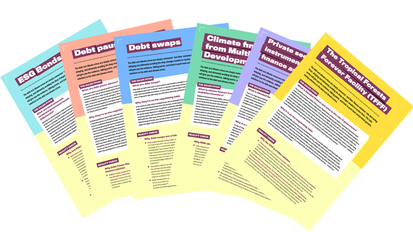 The debt and climate crises are deeply connected - but false ‘solutions’ risk distracting from, delaying, and ultimately avoiding the deep changes needed to resolve them. This mini-series will give you the evidence, talking points, and tools to push back and promote genuine, lasting solutions to the debt and climate crises. These briefings have been produced by the Debt and Climate Working Group |